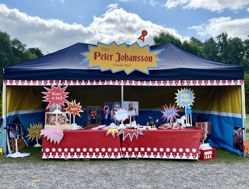 Peter Johansson betecknar sitt konstnärskap som en forskningsresa genom svenskheten. Sedan trettio år har han arbetat konstnärligt med de komiskt traumatiska upplevelser som uppväxten i Dalarna gav honom. I skulpturer och installationer har han ohejdat tagit itu med omhuldade svenska företeelser som dalahästar, falukorv, folkdans, faluröda stugor och rasism. Nu vill han sälja sin konst och sina idéer och kommer till vårt marknadstält på traditionella Sjönevads marknad den 9 augusti.