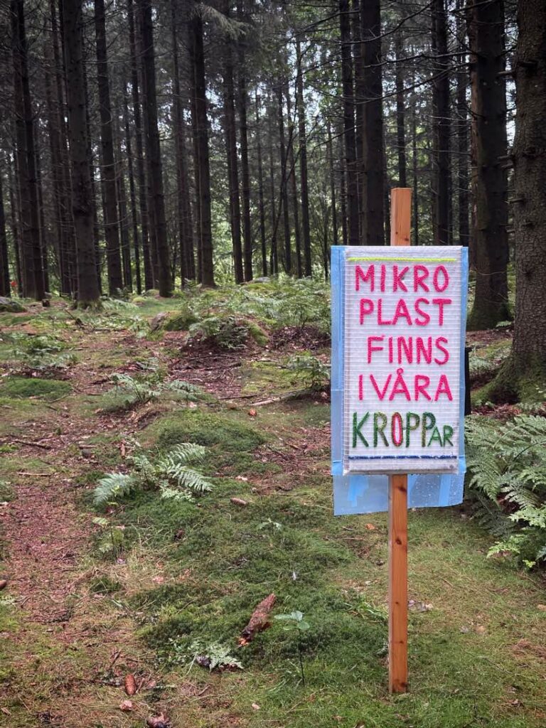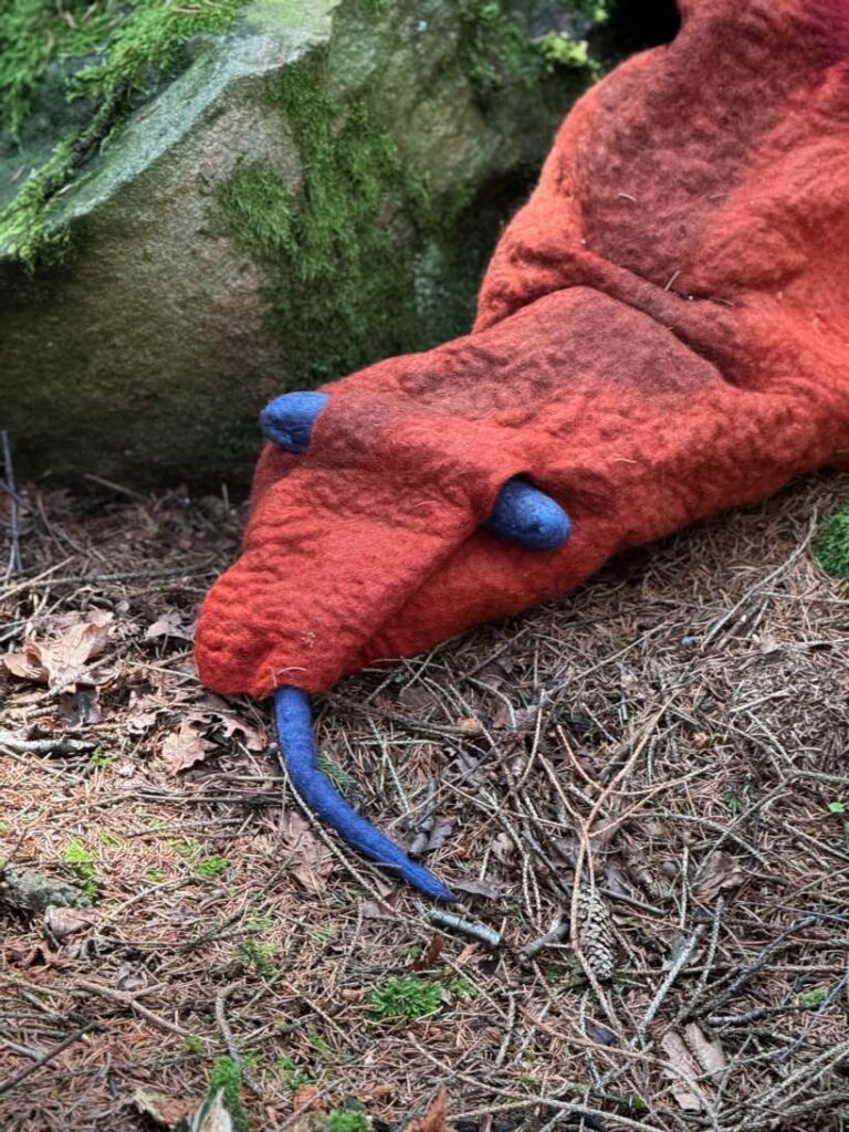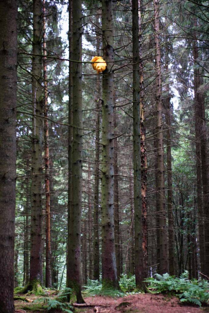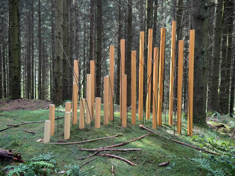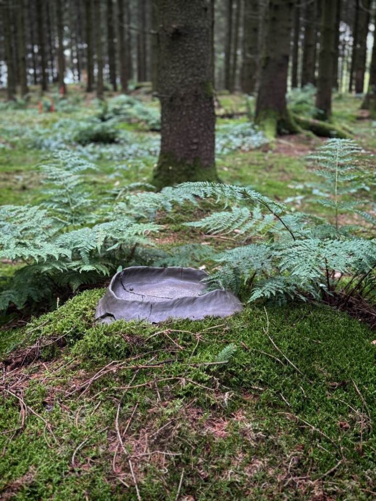 Konstnären berättar: Skogen får sätta sin prägel på verket, som består av obränd, oglaserad lera. Ett utbyte sker därmed, då verket under den tid det ställs ut sätter sin prägel på skogen.