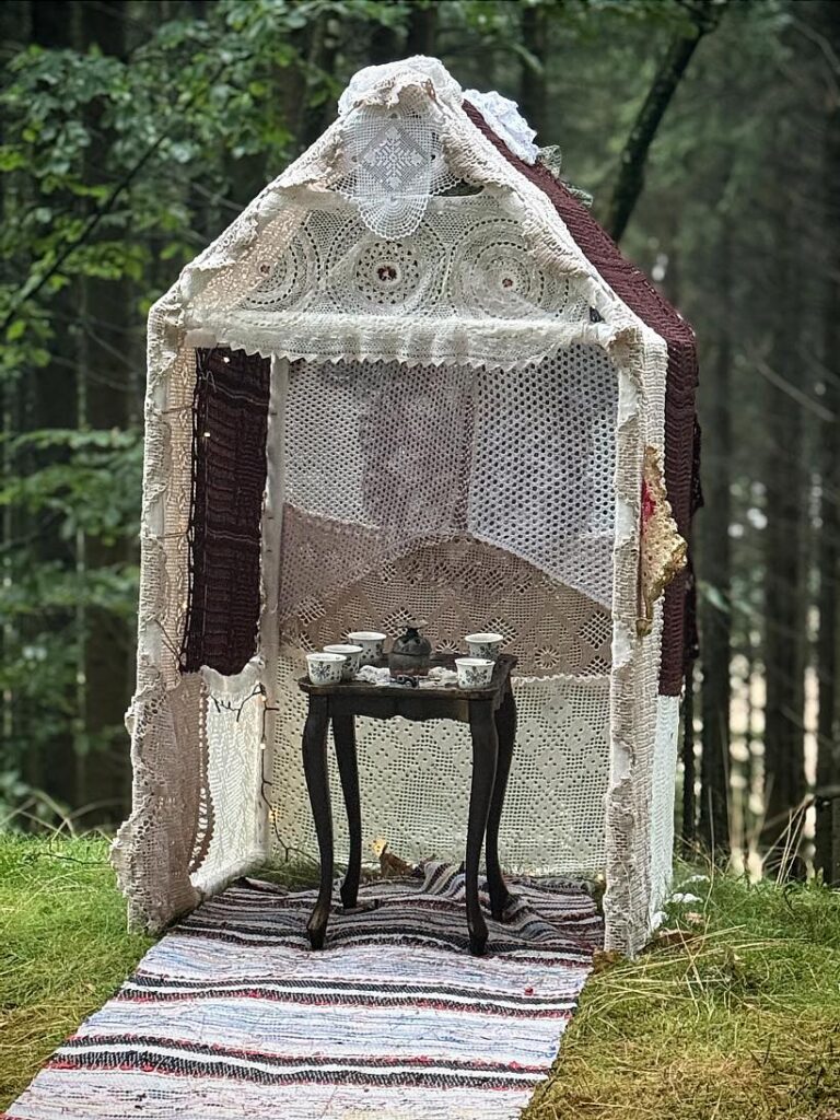 Titel: The house whispers Material: Textil, keramik, virke, plast, kablar, batteri