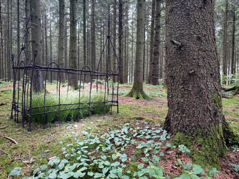 Titel: Lit de mort (Dödsbädden) Material: Rostig ståltråd, armeringsjärn, gräs