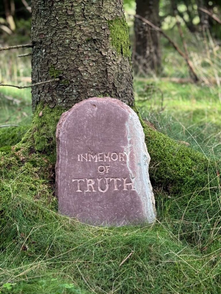 Om konstverket: “The first casualty in war is truth”. I krigstid tillåts inte journalister längre söka sanningen utan riskerar att ses som landsförrädare. Markstående handhuggen skulptur i öländsk kalksten av en fd journalist. Numera stenhuggerska.